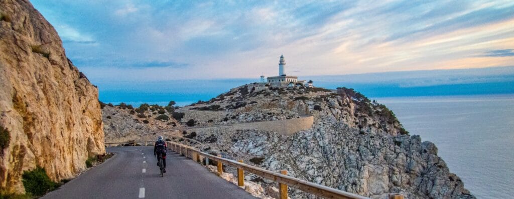 Phare du Cap Formentor aujourd’hui. C’est l’un des itinéraires cyclistes les plus emblématiques de Majorque et il figure sur la liste de nombreux cyclistes du monde entier. Avec des vues incroyables sur la mer Méditerranée, c’est une montée et une descente constantes, des tours et des détours qui mènent au point le plus septentrional de Majorque. Il est recommandé de partir tôt pour éviter la plupart des embouteillages. Après le retour du phare, nous vous suggérons de faire un détour par la belle Cala Sant Vincent pour un délicieux déjeuner de fruits de mer en bord de mer. C’est un long trajet de 98 km depuis l’hôtel et retour, mais nous pouvons offrir des navettes pour commencer le trajet à Port Pollensa, ce qui réduit le trajet à 65 km.