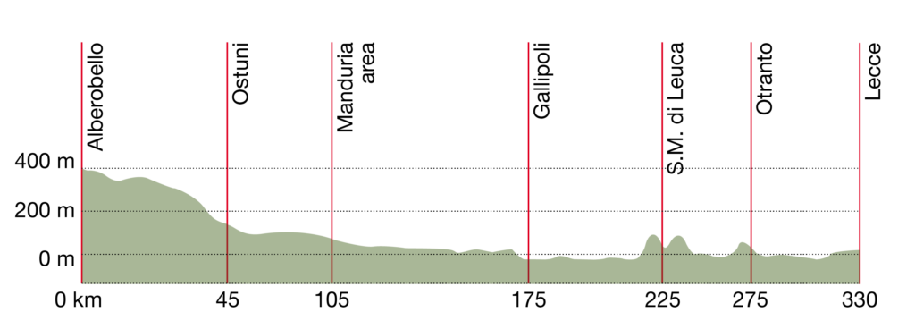 One week’s cycling, 330 kilometers from Alberobello to Lecce. An essentially flat itinerary with a few hilly sections on mostly paved roads with little traffic (outside the high season). Be careful of traffic entering and leaving towns.
